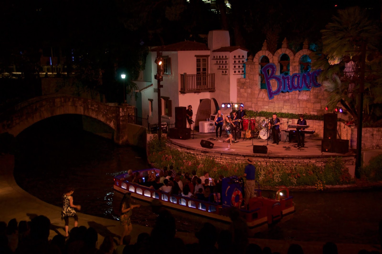 In the evening, we spent a little while watching a free concert along the river. Eventually two bold middle-aged women got up to dance and spin around. I think Nicole was hoping that they would eventually fall into the river. Sometimes we can be like the two old guys on the muppets. After a few songs, we continued on our way along the riverwalk. Earlier I had seen lights strung from trees and hanging from above. I thought it would be quite a sight at night, but none of them were illuminated. Shortly thereafter I discovered why.
