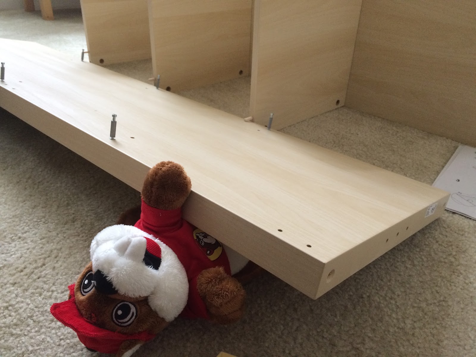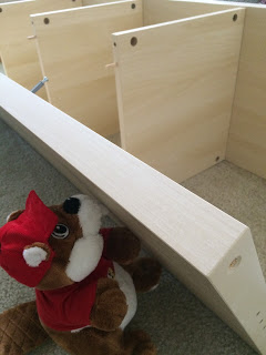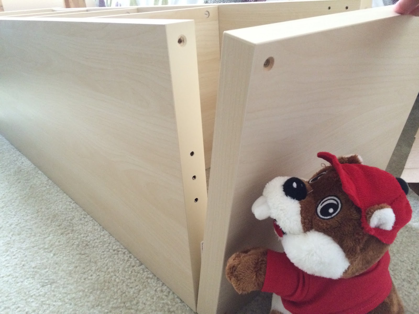 | Buc-ee struggles with the wooden dowels |