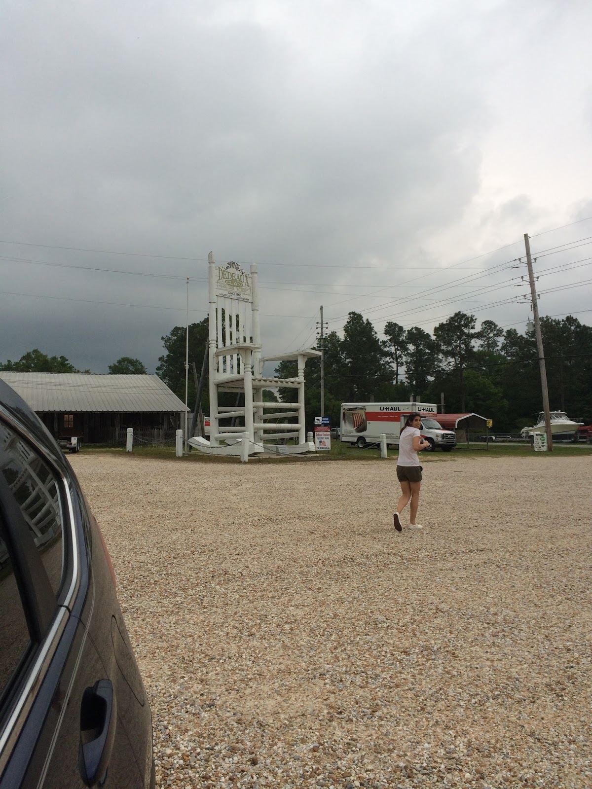 After eating a very southern-style breakfast of grits, andouille sausage, and beignets, we walked a little bit around Mobile. We saw a shipbuilding yard for what can only be described as stealth boats for the navy. There were about as many people out and about during the day as there were last evening. At one point I walked by a cafe where I swear I saw a woman stirring her drink with a strip of bacon. If it wasn’t bacon, I’m not sure what I saw. Around 11:30, we left Mobile and drove through Pascagoula for a bit just to see what it had to offer. It offered nothing other than perhaps the inspiration for the name of the Sassagoula café at DisneyWorld’s Port Orleans resort. We stopped off in Biloxi, Mississippi for lunch. We ate at a quirky place that looked like someone’s house. Nicole and I played checkers while eating sandwiches. Nicole won at checkers and chose our next destination. I am not sure how she even found out about it, but our next stop was a giant rocking chair in Gulfport, Mississippi.