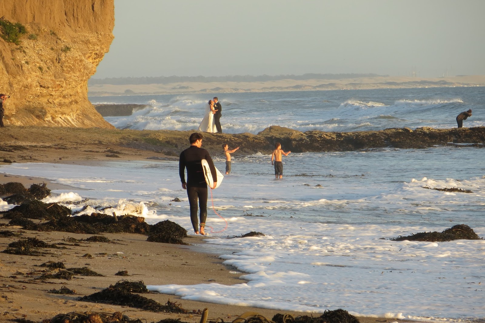 I ended up doing the same route back to Pirate’s Cove, but just walking this time so I could take the pictures you see here. Everyone is very friendly. It has that whole small town feel. Everyone says, “Hello.” After returning from my long walk, I relaxed out on the balcony for a spell (wearing my sweatshirt since it was a bit brisk). I went back out for a stroll along the beach as the sun was going down. There was a wedding couple having their pictures taken and surfers scoping out the waves.