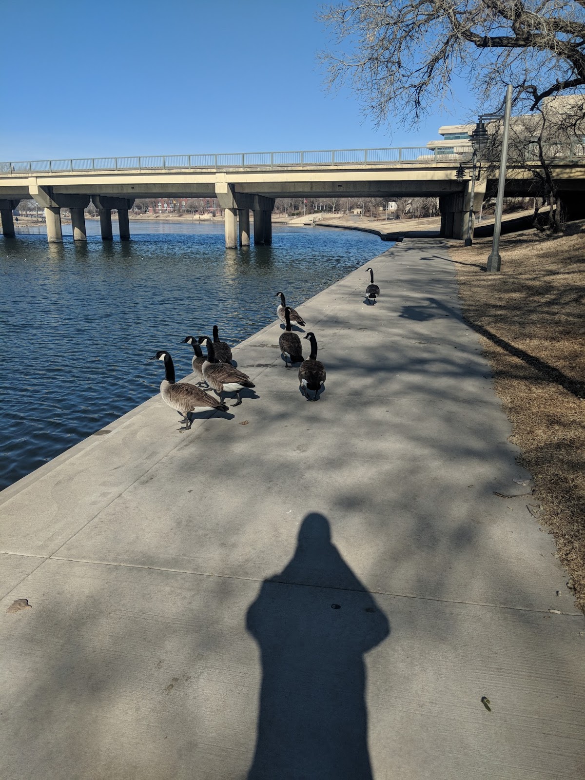As I walked along the riverwalk, the only living creatures I encountered were geese who were too stupid to migrate. They had left a good amount of their poop on the trail to remind me who owned this part of town.