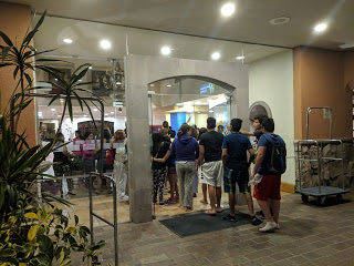 A stray dog was also drawn to us, but soon clashed with the musician, whom the dog did not find to be terribly appealing to his ears. We slowly made our way to catch a taxi to the hotel. We then walked down to the tried and true BrasiTacos, which Nicole is standing in front of here. I shall quote her when she said, “You made it seem like much more of a hole in the wall.” Unbeknownst to her, Nicole has changed a lot these last few years. Brasitacos, I believe, is the definition of a hole in the wall, seeing as though it is in fact missing a wall and its roof is corrugated metal. Nevertheless it has reliably good and safe food (*cough* Applebee’s *cough*) and Nicole had a pair of chorizo tacos for dinner. After this, we relaxed at the hotel by watching American films poorly dubbed into spanish. We tried to go to bed around 9pm local time despite members of a school group running through the halls, yelling, and knocking on doors.