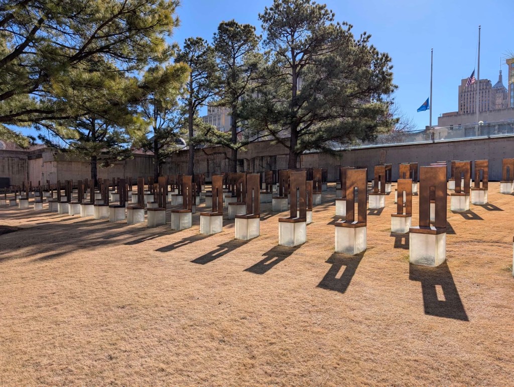 This post is not about the hotel, though. We arrived late in the evening, but would not have to report until around 2pm the following day. I used the time off in the morning to walk to the Memorial of the Oklahoma City bombing, about one mile from the hotel. My original intent was to just pay a visit to the memorial, as the nearby museum was $18, but upon further reflection, and the fact that I don’t expect to find myself in Oklahoma City again anytime soon, I found it prudent to add the museum as well.