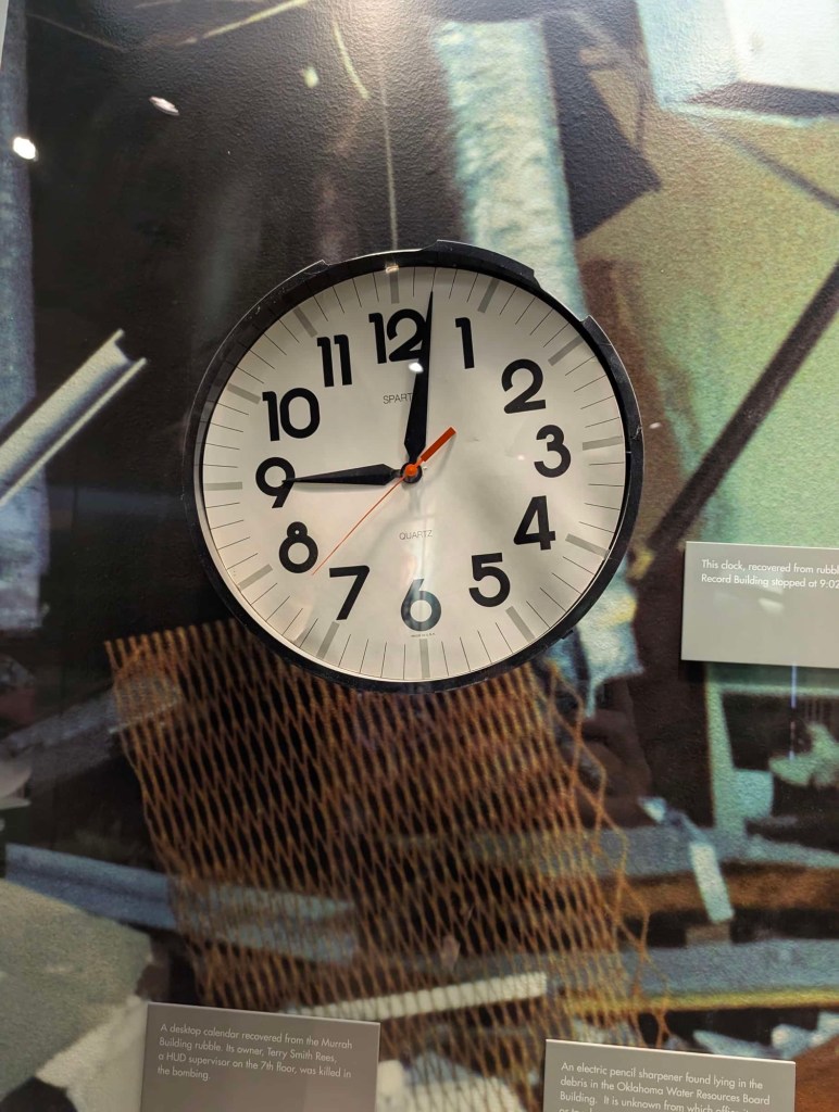 The memorial itself has a reflecting pool separating two large gates with the inscriptions “9:01” and “9:03.” The bomb went off at 9:02 and the times are symbolizing the time before and after and how lives were changed. Empty chairs lining the lawn adjacent to the pool represent all those killed in the attack — 168 being the final accepted tally. The museum was well worth the admission price and very well done. It opened with some context about America in 1995 — setting the stage if you will with references to O.J. Simpson, pagers, and large cell phones.